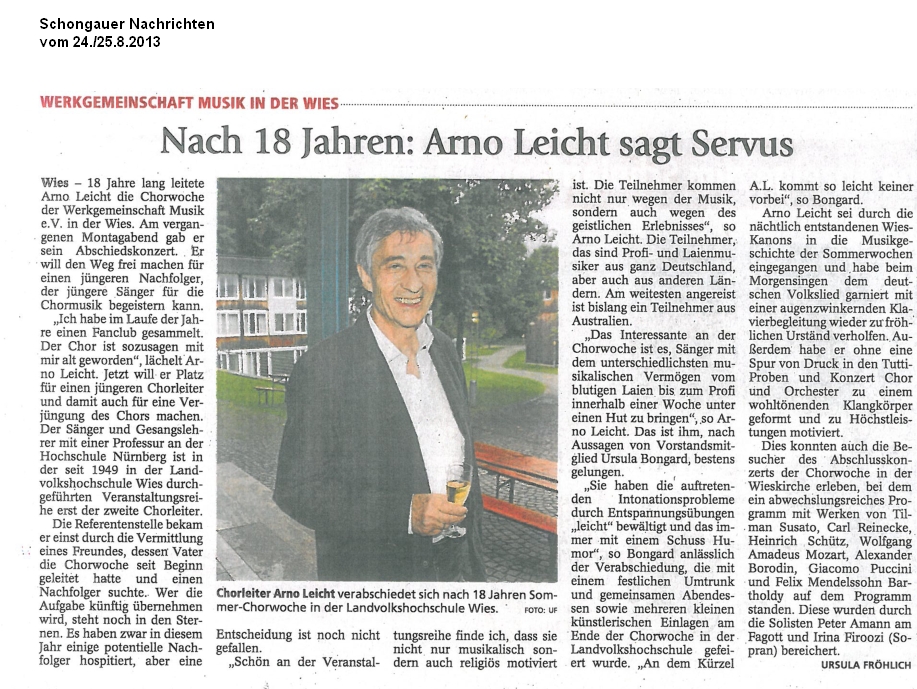 Unter dem Titel "Nach 18 Jahren: Arno Leicht sagt Servus" wurde seine Arbeit auch in den "Schongauer Nachrichten" gewürdigt. Die Veröffentlichung erfolgt mit freundlicher Genehmigung der "Schongauer Nachrichten".