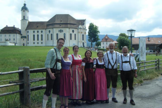 Bevor die Preußen – die meisten TeilnehmerInnen der Woche stammen aus NRW – zur Wieskirche gehen, werfen sie sich „in Schale“: in Dirndl und Lederhosen sehen sie fast aus wie bayrische Ureinwohner!